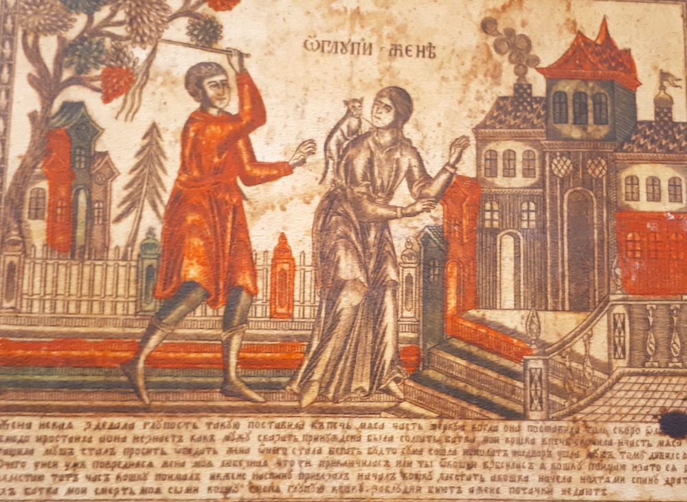 Замужняя женщина загляделась на привлекательного незнакомца. Поэтому и действия ее мужа оправданны. Посыл этого лубка, как и картинки про «Глупую жену и кошку» в современном обществе, вызвал бы как минимум резонанс и осуждение. Но 200-300 лет назад права женщин еще всерьез не обсуждались и подобное воспринималось как само собой разумеющееся.