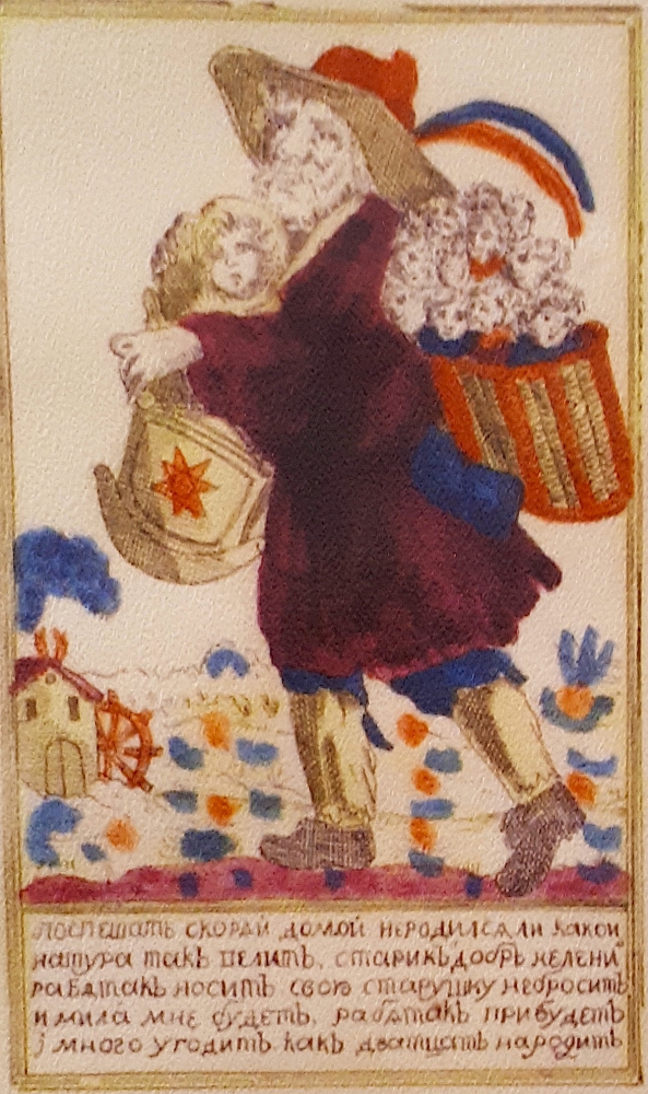 «Поспешать скорей домой – не родился ли какой»… Герой картинки – многодетный и, главное, любящий отец. Все его дети при нем: на руках и за спиной – в специальном коробе. У этого лубка известен один из авторов, а именно – гравер Чуваев. В XVIII веке он работал на Московской Ахметьевской фабрике, где и создавались популярные лубки.