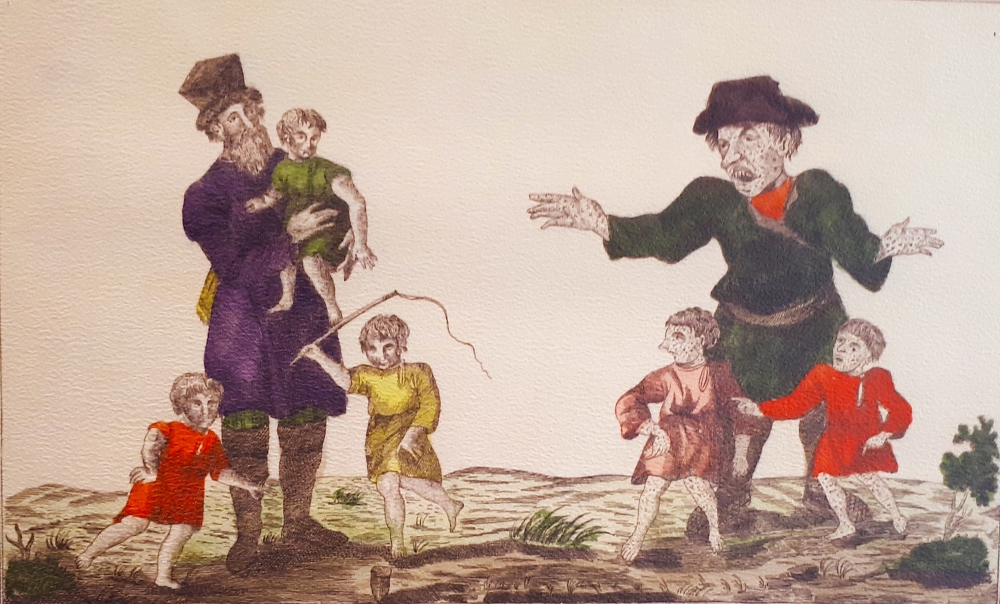Оспа — это особо опасная вирусная инфекция. Стремительно распространявшаяся, она буквально выкашивала население и была бичом вплоть до начала массовых кампаний по прививкам. На лубке изображен здоровый отец с детьми и семейство, заболевшее оспой. Польза прививок налицо.