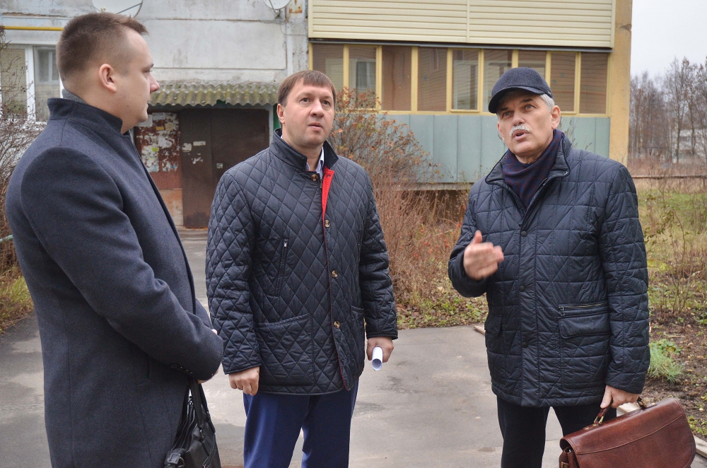 Слева-направо: » и.о. начальника департамента строительства и архитектуры правительства Ивановской области Александр Батурин, глава Ивановского района Сергей Низов, начальник отдела контроля качества жилья Контрольного департамента Фонда содействия реформированию ЖКХ Алексей Керсов