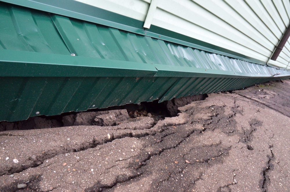На фото, сделанных корреспондентом «Ивановской газеты», видно, что асфальт по периметру основания дома частично провалился и есть дыры, на стенах потеки, ступени к подъезду «гуляют».