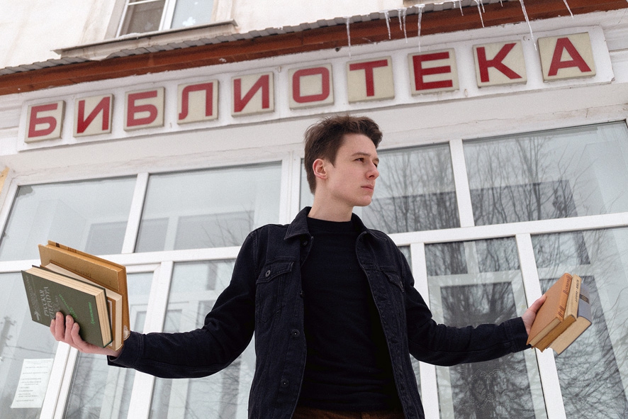 Родион Митюков на фоне советской вывески "Библиотека" (ул. Сахарова, 58).