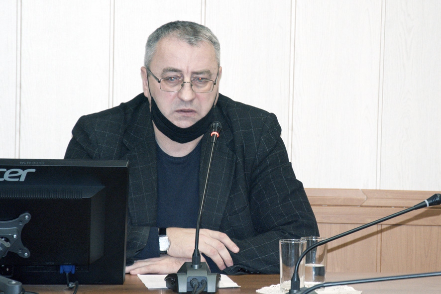 Краевед Александр Семененко участвует в презентации учебного пособия.