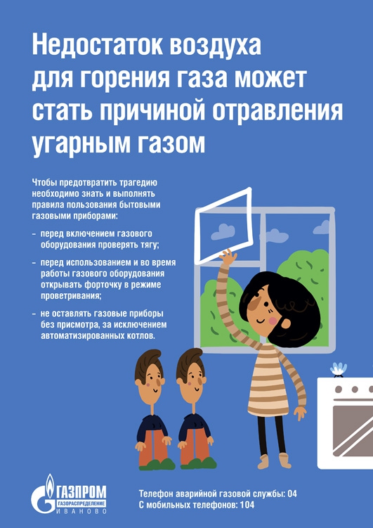 пользоваться газовыми приборами при закрытых форточках (фрамугах), отсутствии тяги в дымоходах и вентиляционных каналах