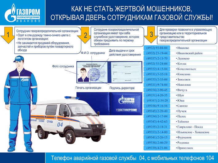 Важные телефоны и адреса. По вопросам, связанным с техническим обслуживанием в Иванове и Ивановском районе, можно обратиться по телефону: (4932) 93-04-04.При обнаружении запаха газа закройте кран перед газовыми приборами, откройте окна, не включайте и не выключайте свет, электроприборы, покиньте загазованное помещение и позвоните в аварийно-диспетчерскую службу по телефону 04, с мобильных телефонов 104 или 112.