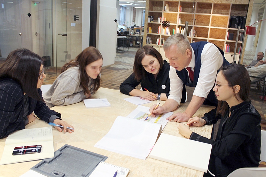 Андрей Козлов в офисе института "Стрелка" с группой архитекторов, работающих над проектом благоустройства Юрьевца.