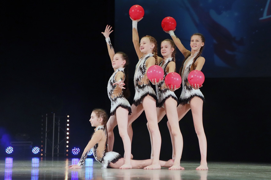 Маленьким детям, которые сейчас приходят к нам, мы даем в первую очередь основы художественной гимнастики. Естественно, при этом они выполняют какие-то танцевальные движения. Потом мы просто всё это соединяем, и на сцене ребята представляют танец с какими-то спортивными элементами. Видоизменяем предметы. Например, у нас был номер про ярмарку, где обручи были в форме баранок. Используем более широкие ленты.