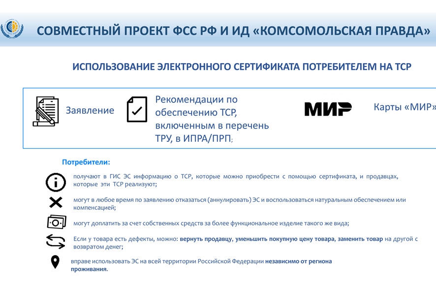 Электронный сертификат представляет собой электронную запись, которая привязана к номеру банковской карты «Мир». Денежные средства, разрешенные Фондом социального страхование на приобретение средств, находятся в резерве на счете в казначействе. В момент совершения покупки денежные средства одномоментно поступают на карту «Мир» и списываются со счета.