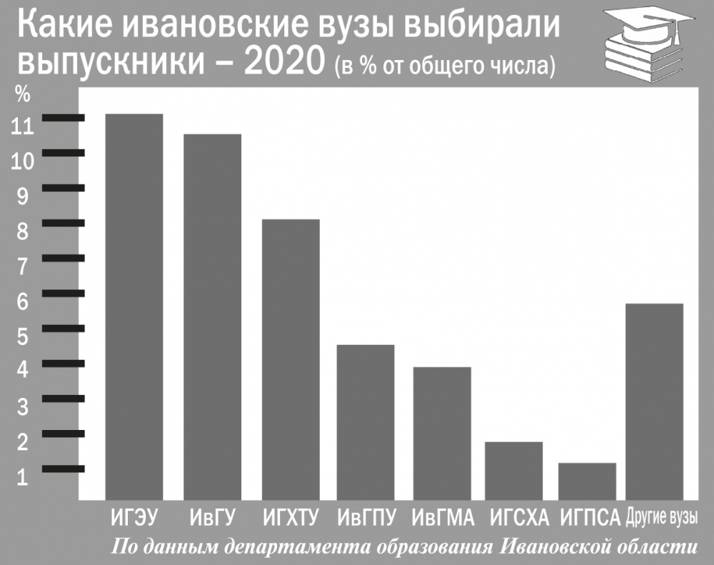 Цифры. 47,2% выпускников прошлого года, по данным департамента образования, поступили в ивановские высшие учебные заведения. На верхушке рейтинга местных вузов оказались энергоуниверситет и госуниверситет, которые выбрали соответственно 11 и 10,5% выпускников. На третьем месте по популярности у ивановцев в прошлом году – химико-технологический университет, в нем продолжили учебу 8%.