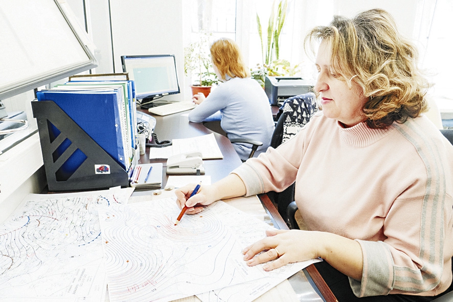 Синоптик Марина Афонина оформляет высотную карту барической топографии, по которой можно понять направление ветра, а также определить зоны высокого и низкого давления.