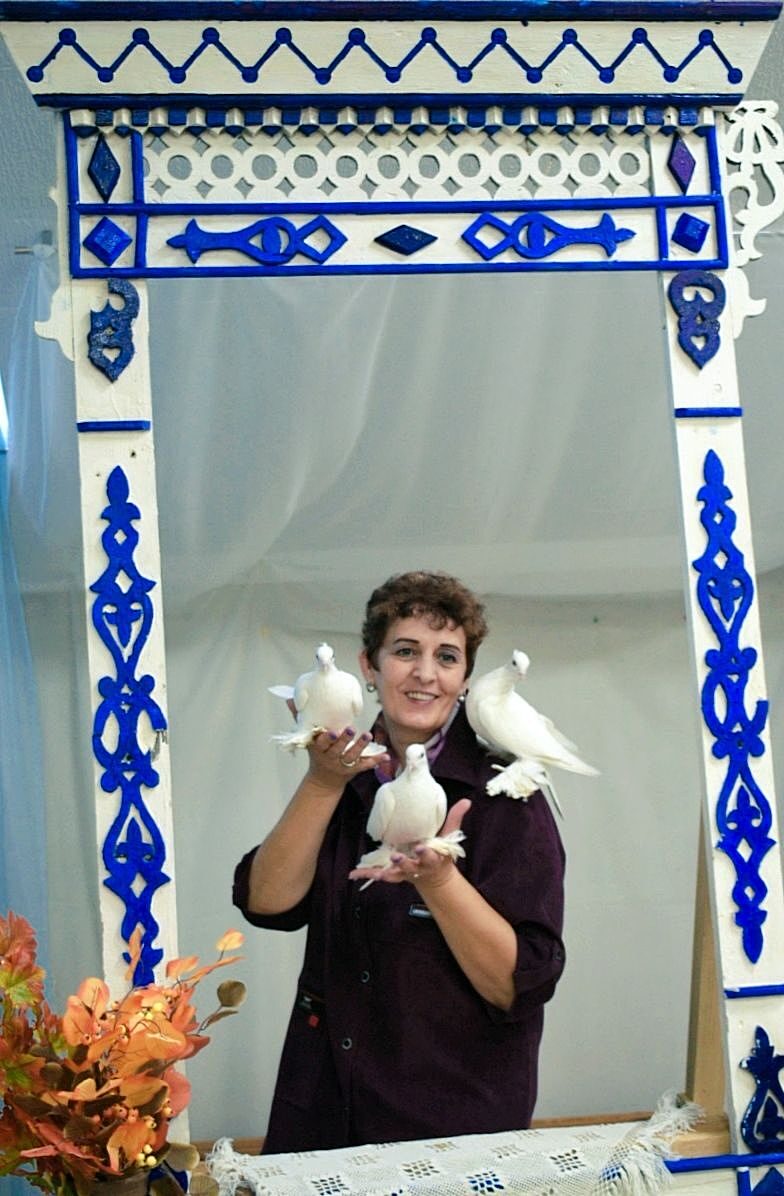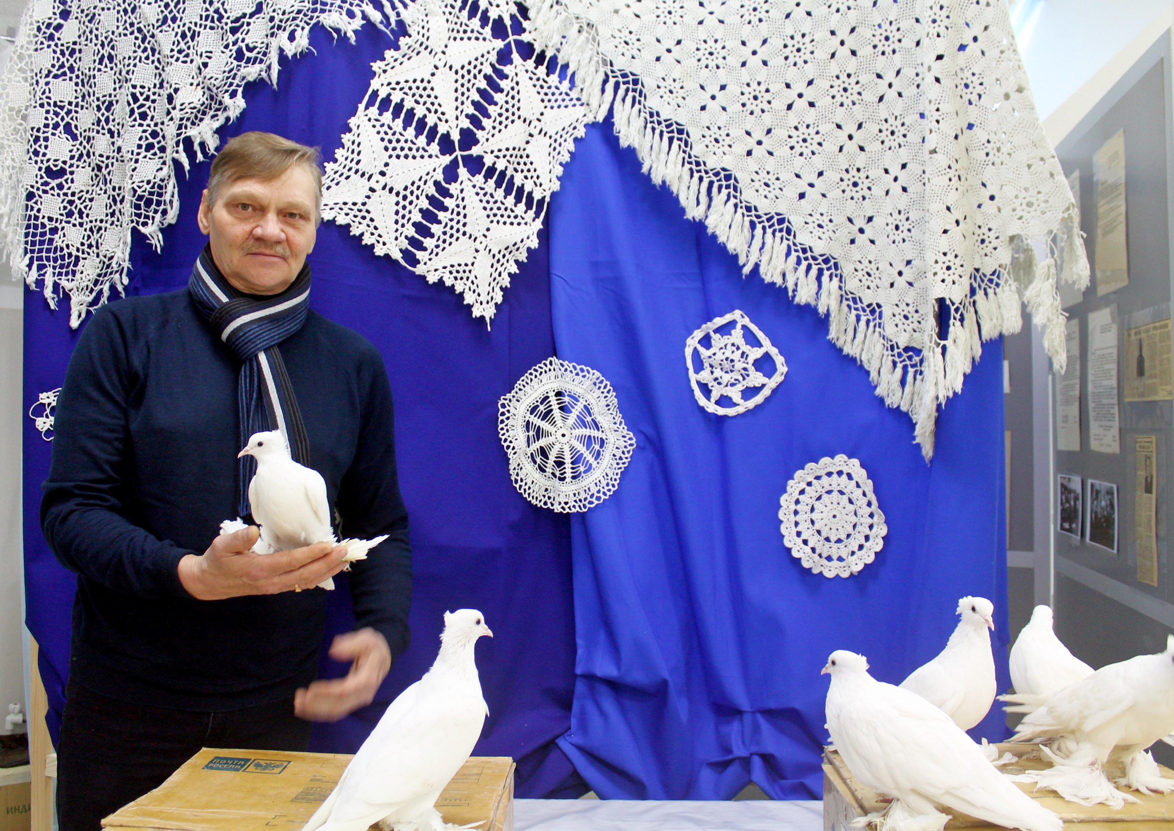 На выставке работала фотозона в виде настоящего наличника. Посетители могли сфотографироваться с ручными белыми голубями ивановского заводчика Валерия Замотаева.