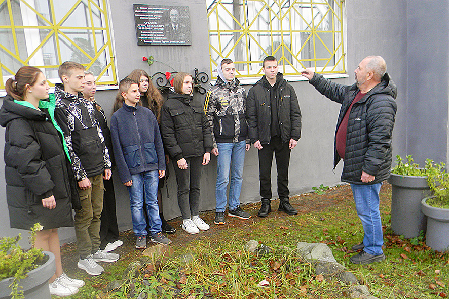 Глава поселения Сергей Беляев с юными волонтерами у мемориальной доски Денису Суханову.