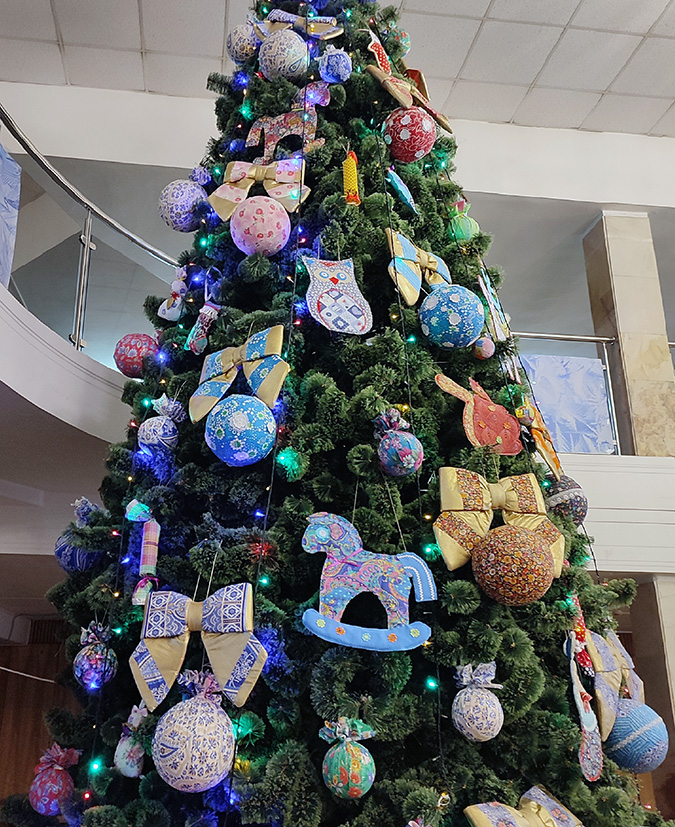 Художественный руководитель клуба лоскутного шитья "Русский стиль", народный мастер Ивановской области Любовь Степанова, рассказала, что для изготовления игрушек для "ситцевой" елки ткани взяли из закромов клуба – это ситцы, бязь, сатин 1990-х годов. Каждая игрушка имеет твердое основание из гофрированного картона, чтобы не деформировалась, так как размер достигает 40 сантиметров.