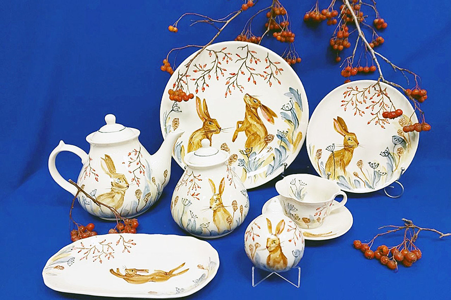 Ивановская фабрика удивительных игрушек "Моя забава" создала к Новому году множество интересных изделий: статуэтку фарфорового зайца с конфетой, игрушки на елку из ваты и фарфора с изображением ушастика, а также целый фарфоровый сервиз с семейством хвостатых.