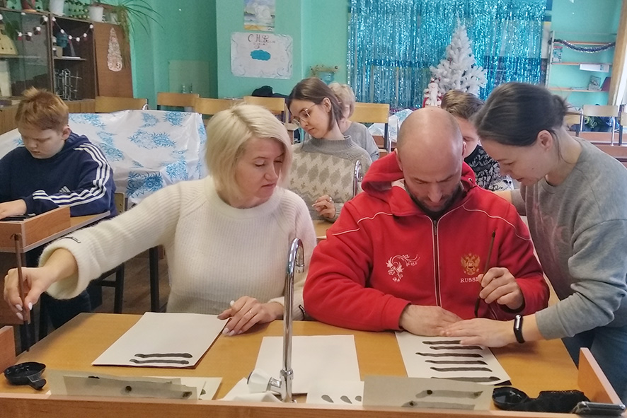 С основами японской каллиграфии всех собравшихся в школьном кабинете познакомила ивановский журналист, монтессори-педагог Виктория Карпанова (о том, как она по методике Марии Монтессори воспитывает сына, "Ивановская газета" писала в 2019 году). Сейчас Карпанова живет в Москве, а в Иваново приезжала к родственникам на новогодние каникулы.