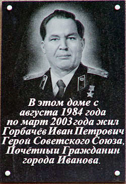 Имя Героя Советского Союза Ивана Горбачёва, почетного гражданина города, первого председателя Ивановского совета ветеранов, запечатлено лишь на очень скромной мемориальной плите дома на улице Пушкина, 33, где жила его семья. И
