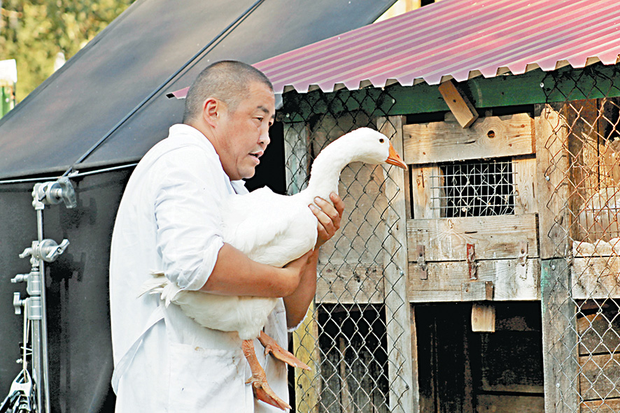 Повар Тимур с одним из главных героев фильма, гусем Беляшом.