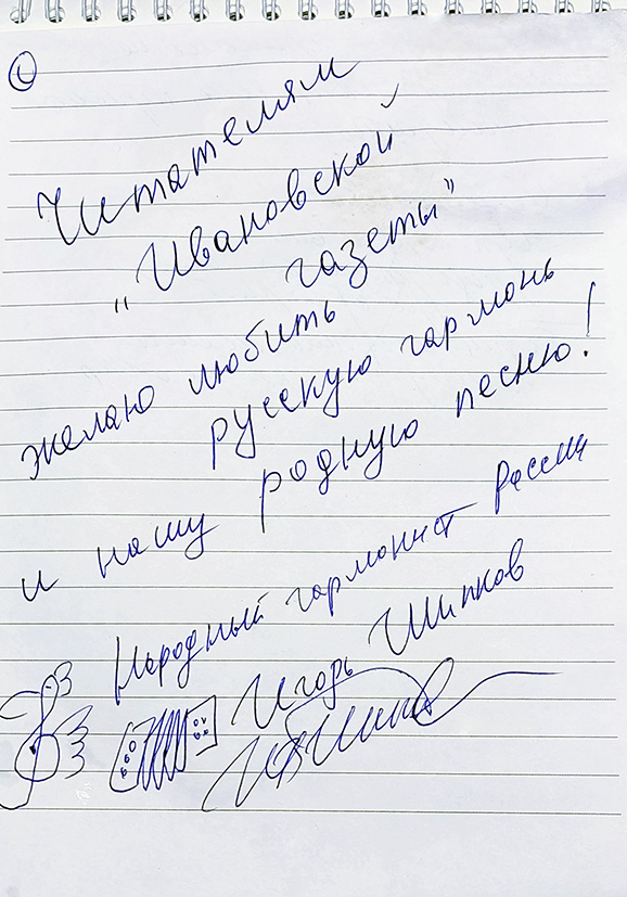 Кстати, у Игоря Шипкова есть обязательное правило: для зрителей, пришедших с гармошкой, вход исключительно бесплатный. В этот раз на его выступление принесли шуйскую гармонику, на которой артист исполнил несколько песен и признался, что играть на ней проще и легче, чем на его инструменте, заказанном специально в Туле.