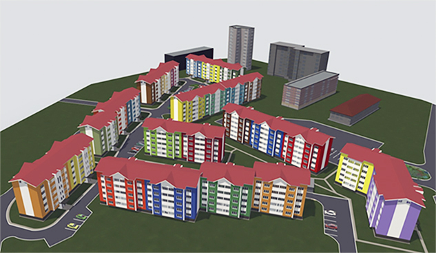Комплекс "Иван-да-Марья" на улице Революционной в Авдотьине решен так: дом "Иван" – в жестких обострённых формах: прямоугольные балконы и другие элементы. А "Марья" – пластичная, с кокошниками. Еще дальше в том микрорайоне, на улице лейтенанта Жидкова, – комплекс "Самоцветы". Там большое пространство, место открытое, есть гора. Каждое здание имеет своё название, а цвет определяется цветом камня.