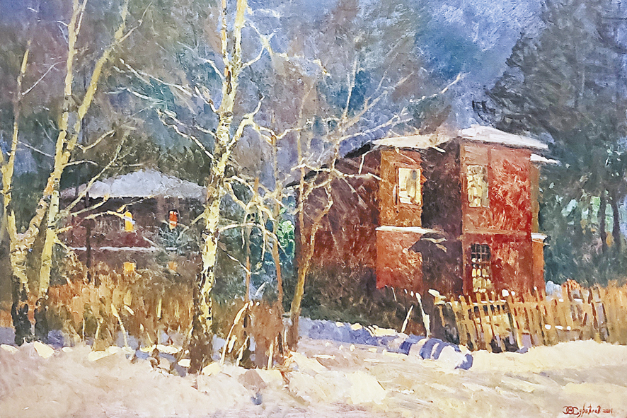 На холстах, представленных на выставке в Родниках, притаились уютные улочки малых городов, наполненные ностальгией и теплом, блестят на солнце родные речки, бросают волшебные тени мартовские сугробы, радует глаз лунная ночь в Плёсе, трогают душу маковки старинных церквей…