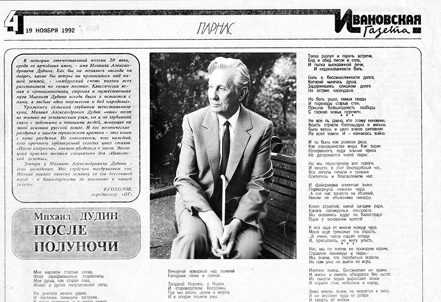 Конечно, Михаила Дудина лишь условно можно отнести к ивановским поэтам, ведь наш земляк жил и творил в Ленинграде. И всё же ивановцы не зря считают его своим. Для ивановских поэтов-фронтовиков он был ориентиром, мерилом качества, задавал некую планку. Многое сделал для того, чтобы сохранить в литературе имена погибших на войне Николая Майорова и Алексея Лебедева. Поддерживал связь с писательским и журналистским сообществом, печатался в местных СМИ.