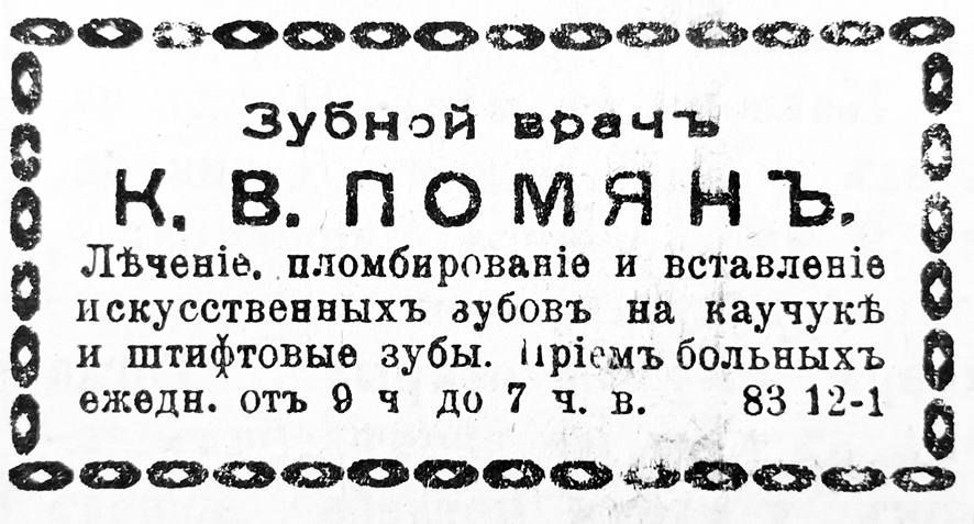 Зубные врачи начала XX века активно рекламировали свои услуги в газете "Ивановский листок". Так, в объявлениях за 1913 год сообщалось, что стоматолог Анна Розенблат переехала в церковный дом на Покровской улице. Прием больных осуществлялся по-прежнему два раза в день – с 10 до 14 и с 15 до 18 часов.