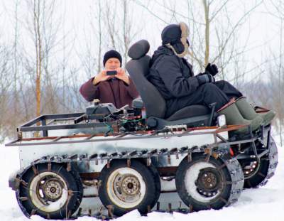 По хорошей дороге агрегат разгоняется до 25 километров в час, расход бензина – около двух литров на 100 километров. Михаил ездит на нем на охоту и за грибами. Впрочем, на трассу не выезжает: оформить техпаспорт на его мини-вездеход практически невозможно.