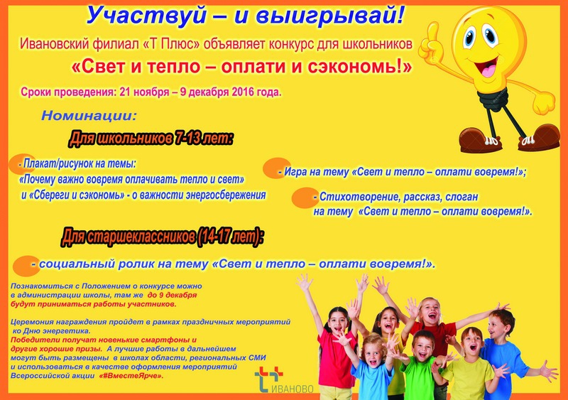 Номинации: Плакат/рисунок на темы: «Почему важно вовремя оплачивать тепло и свет» и «Сбереги и сэкономь» - о важности энергосбережения; игра, стихотворение, рассказ и слоган на тему «Свет и тепло – оплати вовремя!» - для школьников 7-13 лет. А также социальный ролик на тему «Свет и тепло – оплати вовремя!» - для старшеклассников 14-17 лет. Познакомиться с Положением о Конкурсе можно в администрациях школ, там же будут приниматься работы участников. Победители получат ценные призы.