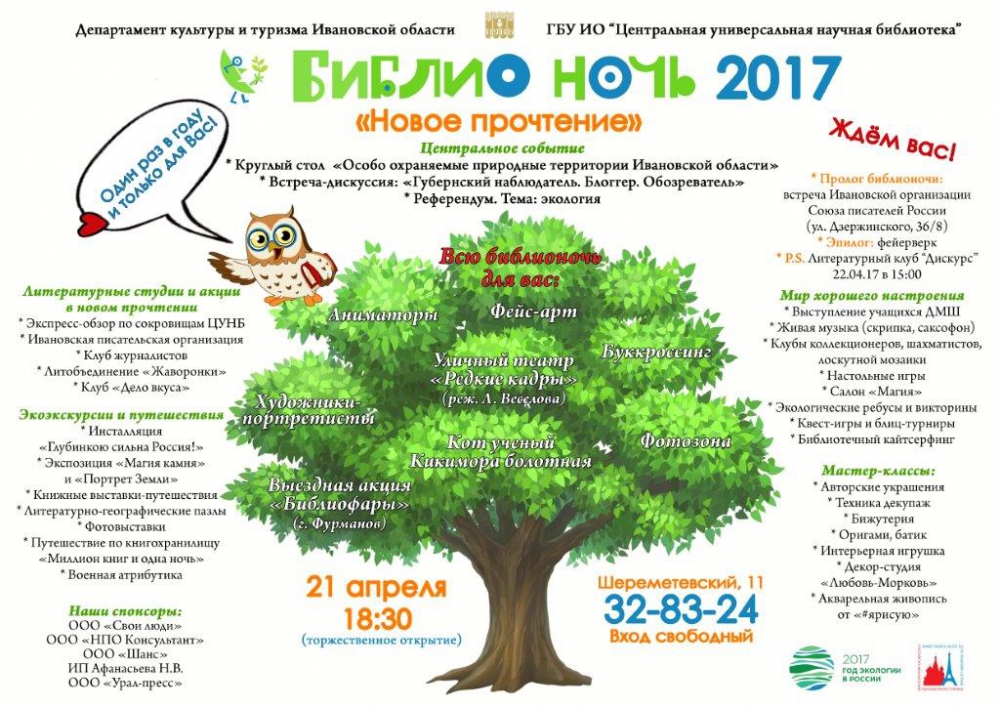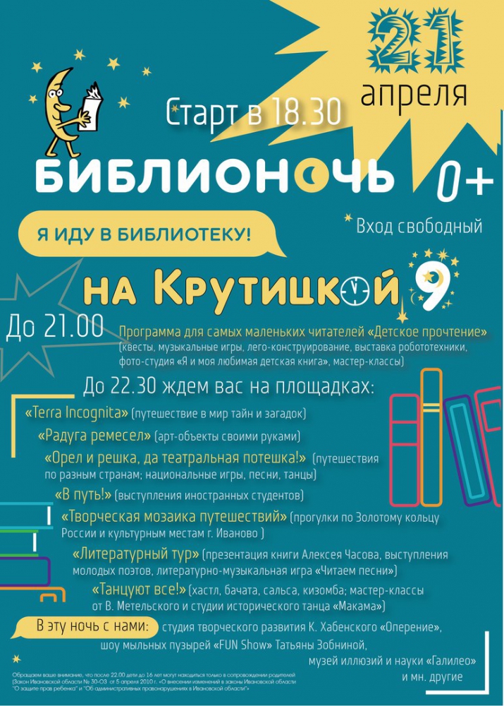 Запланирована целая серия мероприятий - и в Ивановской областной библиотеке для детей и юношества, и в Центральной универсальной научной библиотеке (см. программы ниже). В обеих библиотеках «Библионочь» начнется в 18.30. ВХОД БЕСПЛАТНЫЙ.