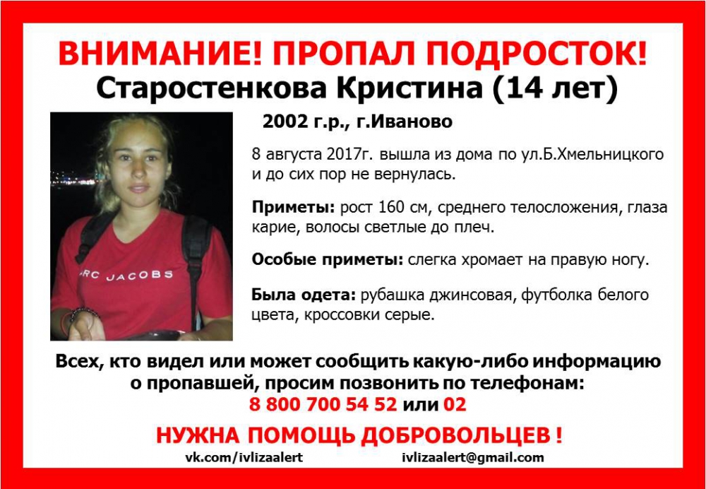 Полиция просит всех, кто располагает какой-либо информацией о Кристине, сообщить по телефонам (4932) 48-16-02, 35-48-05 или 02.