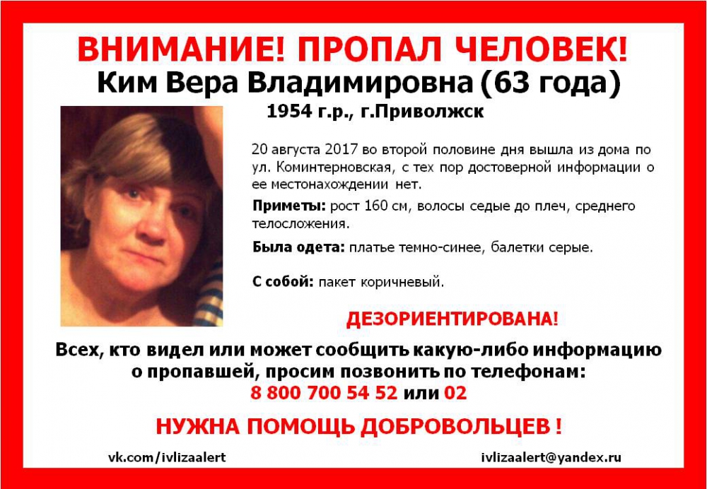 Как сообщает ПСО, Вера Владимировна 20 августа во второй половине дня вышла из дома на ул. Коминтерновская в Приволжске, и с тех пор достоверной информации о ее местонахождении нет.