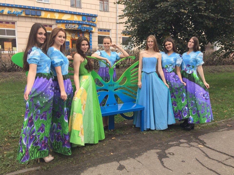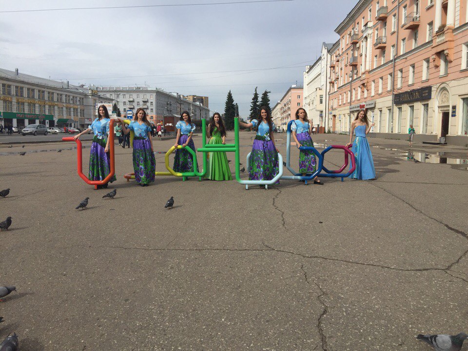 Девушки, принимающие участие в конкурсе "Ивановская красавица-2017", сфотографировались на фоне арт-объектов, установленных в Иванове за последние месяцы, а также на театральных скамейках на площади Пушкина.