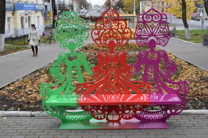 Селфи-скамья "Три девицы" установлена в пятницу, 20 октября в начале проспекта Ленина. Это стилизованное изображение девушек в кокошниках.