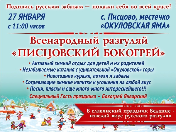 Всенародный разгуляй «Писцовский бокогрей» состоится в субботу, 27 января в селе Писцово Комсомольского района, начало - в 11.00.