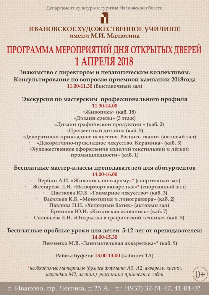 В ходе мероприятия абитуриенты познакомятся с администрацией училища, заведующими отделениями, ведущими преподавателями, студентами, с правилами приема, программой вступительных испытаний, сообщает областной департамент культуры и туризма.