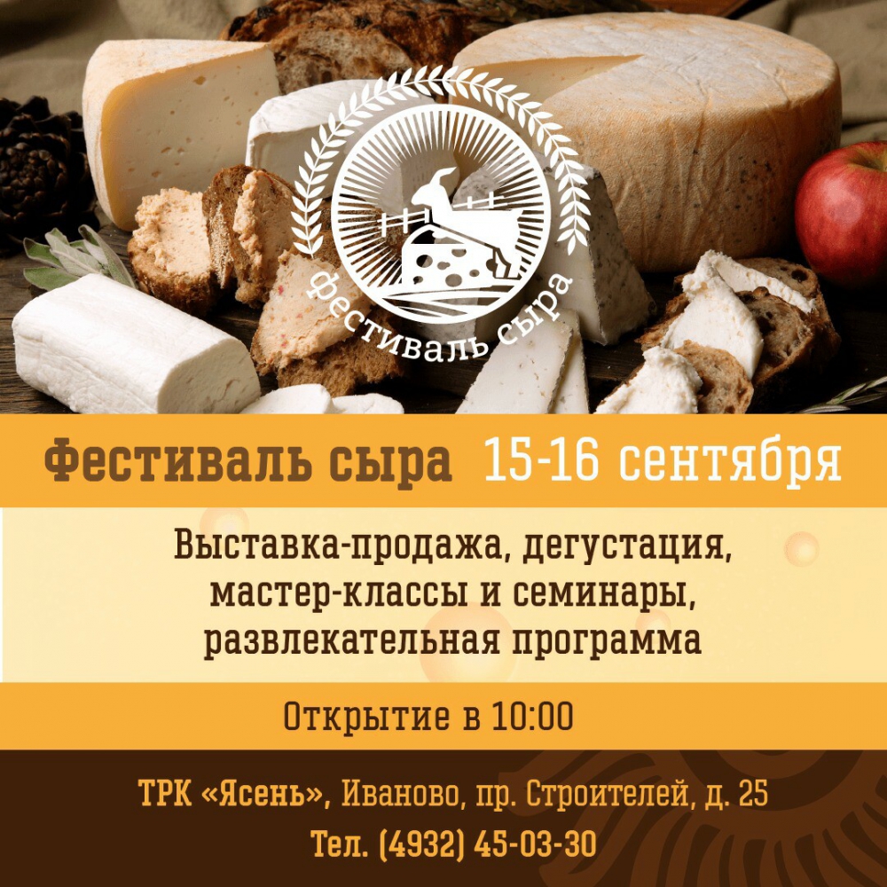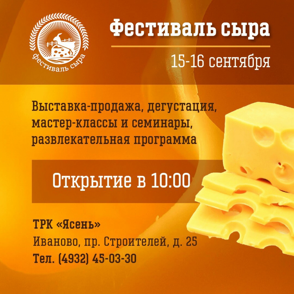 Фестиваль сыра пройдет 15-16 сентября на площадке у ТРК «Ясень» (г. Иваново, пр. Строителей, д. 25).