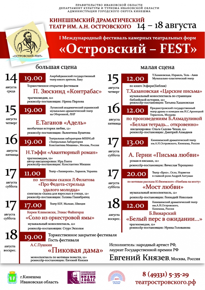 Первый Международный фестиваль камерных театральных форм «Островский-FEST» откроется 14 августа в 19.00 в Кинешемском драматическом театре им. А. Н. Островского спектаклем по пьесе Патрика Зюскинда «Контрабас» Азербайджанского государственного театра юного зрителя.