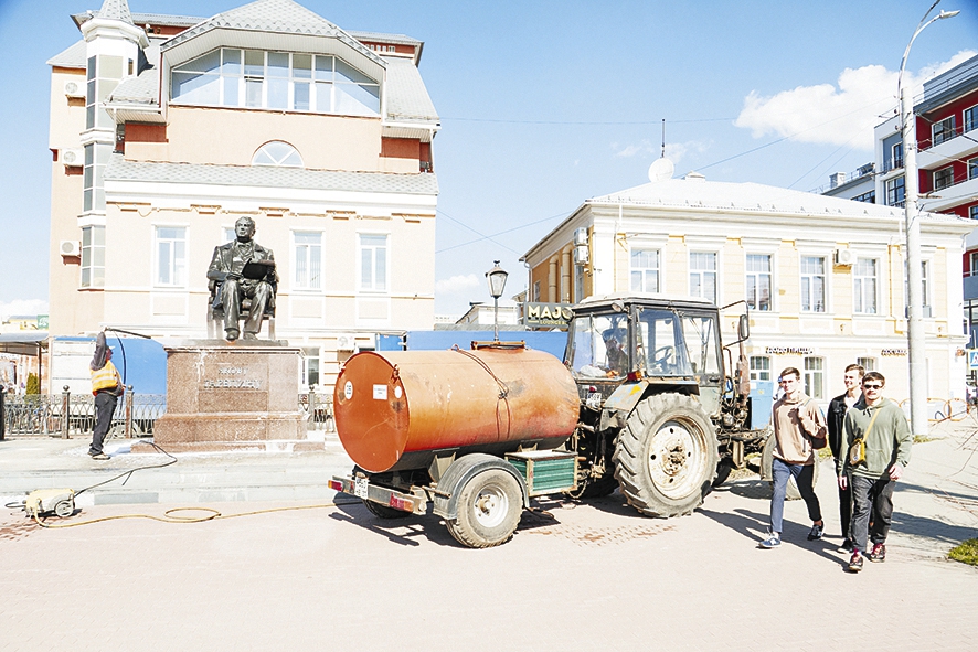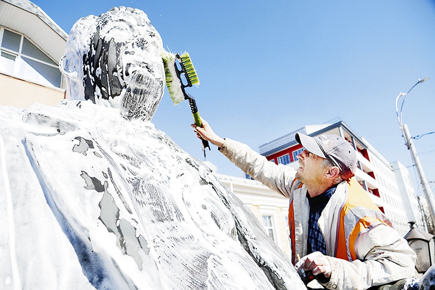 Как только весной среднесуточная температура воздуха переваливает за плюс пять градусов, работники ивановского "Горзеленстроя" начинают приводить в порядок памятники и благоустраивать территории вокруг них. Для мойки монумента очень важно, чтобы на улице было нежарко, иначе чистящий состав очень быстро высыхает. В этом году первым на очереди в облцентре был памятник Якову Гарелину. Статую очистили от загрязнений, а также покрасили лавочки около нее.