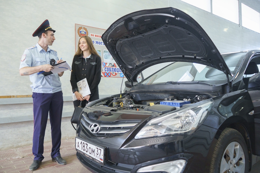 Государственный инспектор проверил автомобиль для постановки его на учет. Сверку узлов и агрегатов в день проходит около 100 машин.