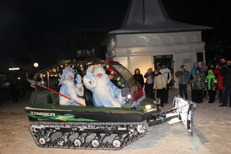 В Кинешму Дед Мороз приехал чуть раньше. В среду, 21 декабря, волшебник удивил всех, появившись не на классической тройке, а на гусеничном вездеходе-амфибии. Он зажег огни на главной елке Кинешмы и дал старт новогодним мероприятиям.