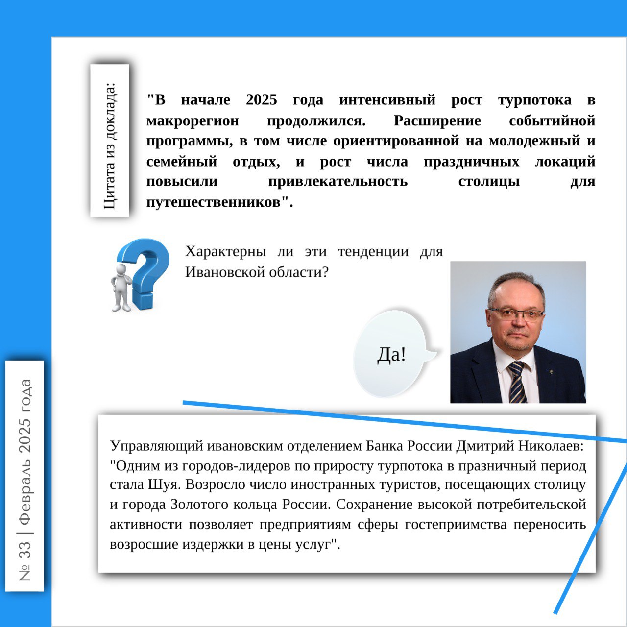 В регионах ЦФО также продолжает расти выпуск одежды и отмечается рост туристического потока. Среди лидеров по приросту турпотока в период новогодних праздников называется Шуя. Эти тенденции прокомментировал управляющий ивановским отделением Банка России Дмитрий Николаев (комментарии в карточках).