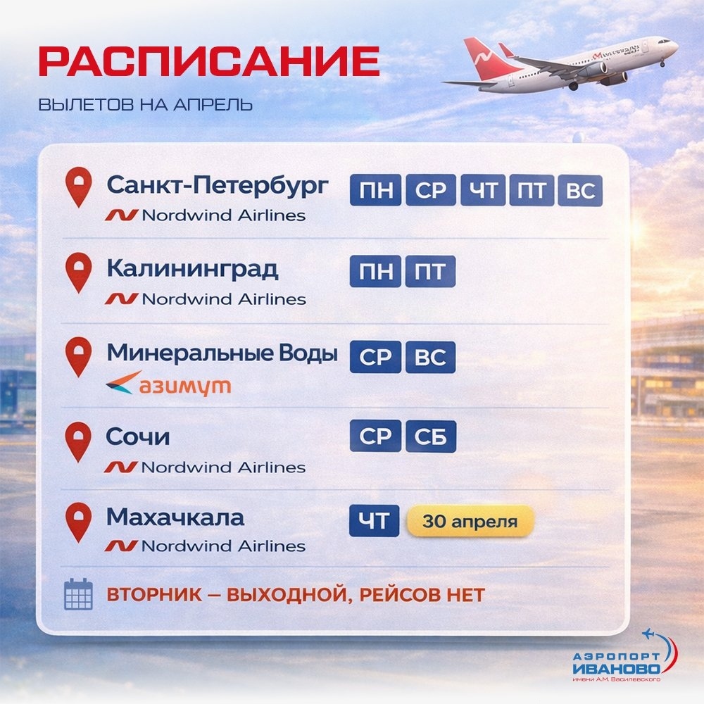 Ивановский аэропорт имени А.М. Василевского обновил расписание авиарейсов, сообщается в группе аэропорта в соцсети "ВКонтакте".