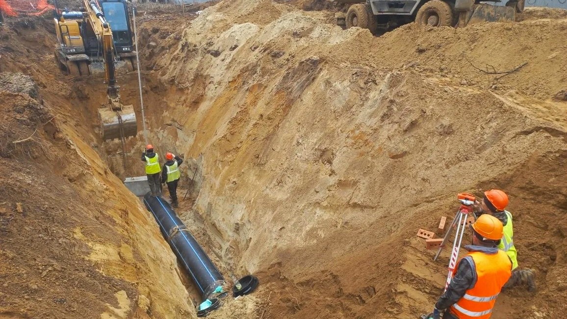 Работы стартовали месяц назад. Сейчас на объекте работают две бригады и спецтехника: экскаваторы, самосвалы, краны. Уже расчистили трассу, ведётся разработка котлована, проложено 200 метров труб и смонтировано 9 смотровых колодцев. Главная сложность – большое количество пересекающихся коммуникаций.