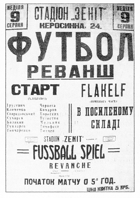 Летом 1942 года на одном из пустырей Киева, возле хлебозавода, в свободное от работы время начали тренироваться бывшие киевские футболисты "Динамо" и "Локомотива". Когда об этом стало известно оккупационным властям, они сформировали из них команду "Старт". Немцы посчитали: чтобы народ не бунтовал, нужно дать ему хлеба и зрелищ.