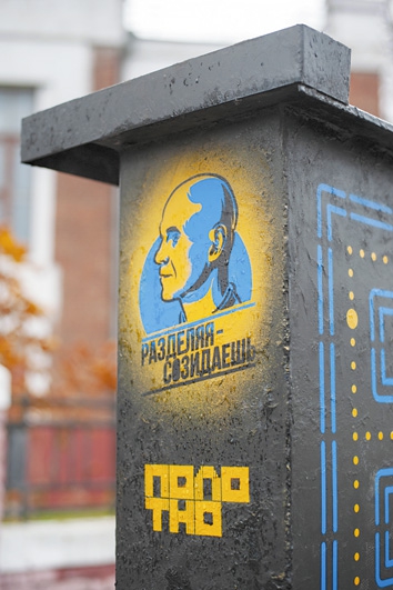 Уличный художник Андрей Филаретов (FAV) около своей работы на площади Ленина.