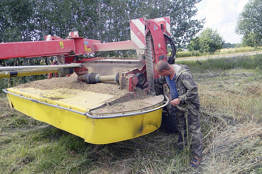 Одновременно "Подолино" ведет заготовку кормов. Механизатор Владимир Крупин расчищает нож косилки.